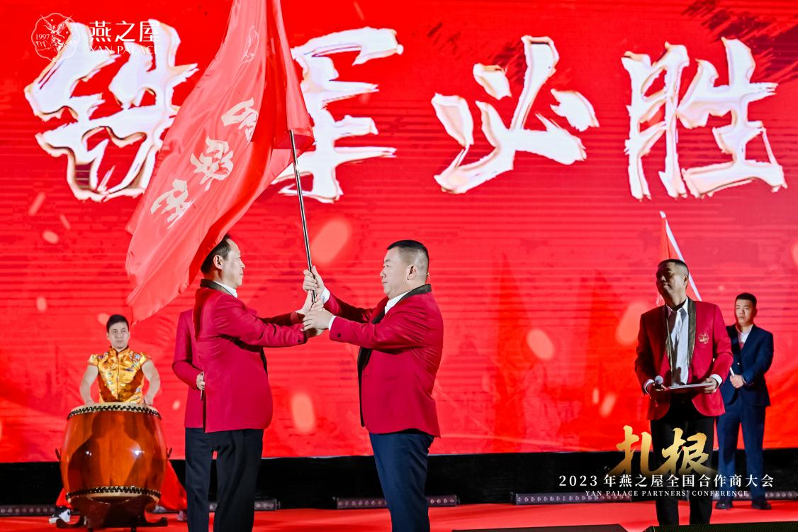 圖:燕之屋創(chuàng )始人、董事長(cháng)黃健授予燕之屋鐵軍軍旗