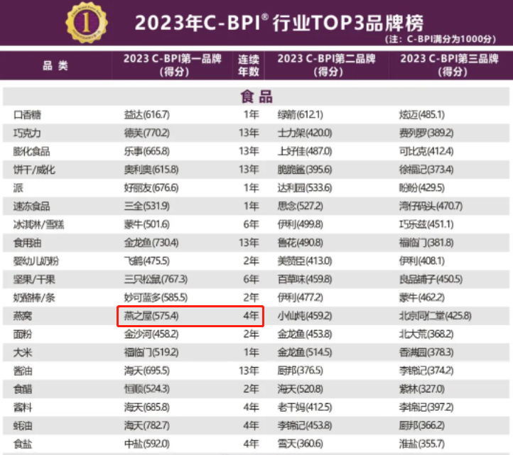 圖:燕之屋連續四年榮登中國品牌力指數SM(C-BPI®)燕窩品類(lèi)排行榜第一