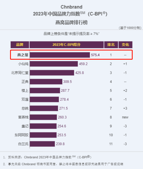 圖:燕之屋榮登2023年(第十三屆)中國品牌力指數SM(C-BPI®)燕窩品類(lèi)排行榜第一