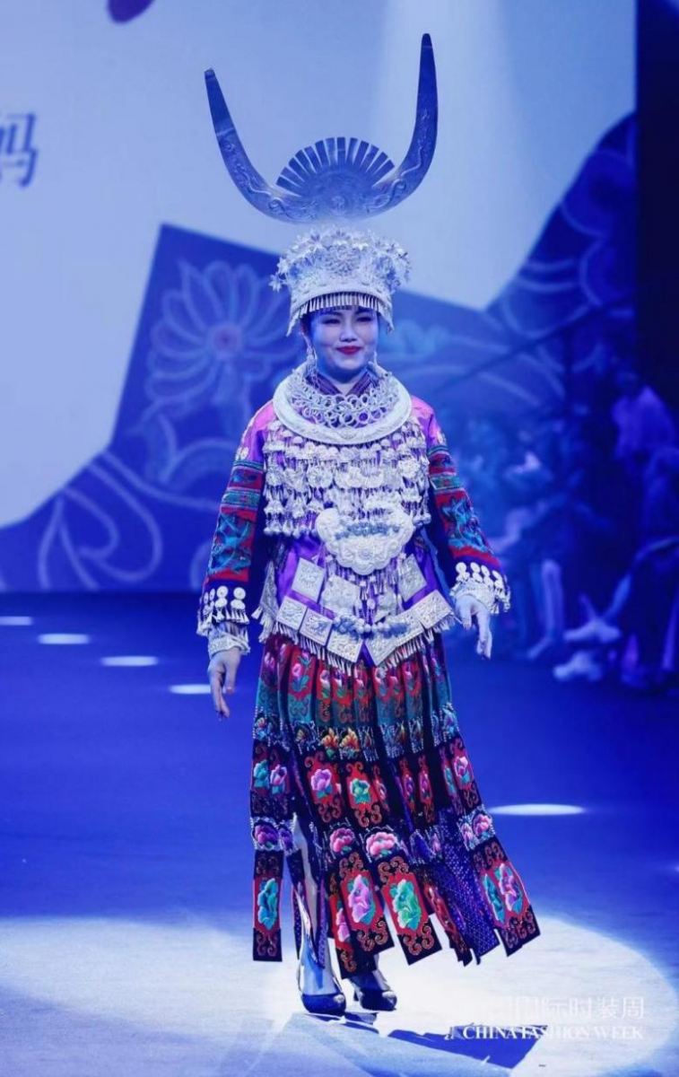 圖:燕之屋“天才媽媽”貴州苗繡夢(mèng)想工坊主理人劉英登上中國國際時(shí)裝周走秀舞臺