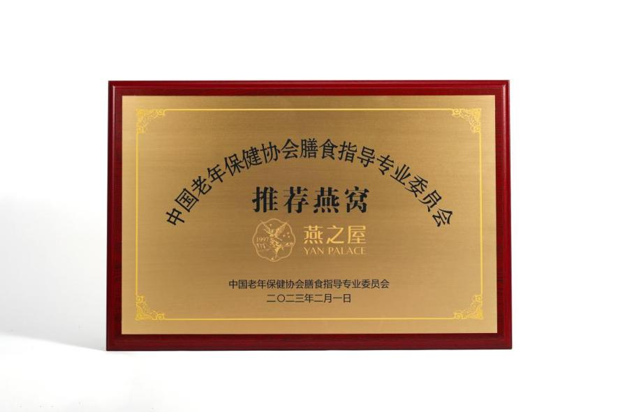 圖:燕之屋榮獲中國老年保健協(xié)會(huì )膳食指導專(zhuān)業(yè)委員會(huì )推薦燕窩榮譽(yù)牌匾、