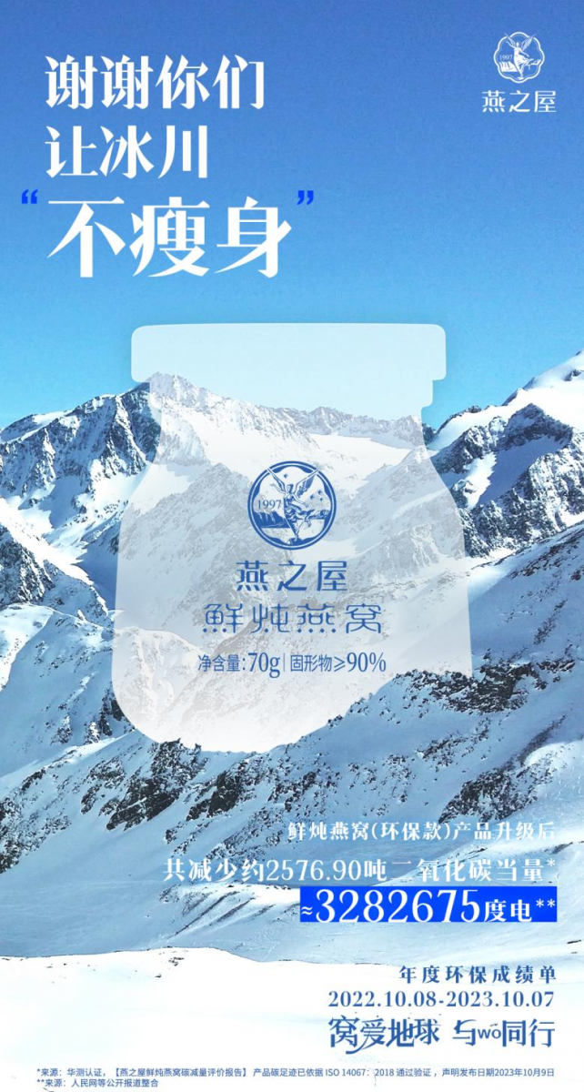 作為新華社品牌工程成員企業(yè)、燕窩行業(yè)“領(lǐng)頭燕”,燕之屋以助力“雙碳”目標為發(fā)展旗幟,積極投入綠色轉型、創(chuàng )新綠色生產(chǎn),減碳成績(jì)相當亮眼。10月25日,燕之屋在北京舉辦新一代鮮燉燕窩發(fā)布會(huì )暨年度環(huán)保成果報告會(huì ),正式推出年度環(huán)保新品——燕之屋新一代鮮燉燕窩,并揭曉年度環(huán)保行動(dòng)成果,公布碳排放測定數據。2022年10月08日至2023年10月07日,鮮燉燕窩(環(huán)??睿┊a(chǎn)品升級后約減少2576.90噸二氧化碳當量*,減少的二氧化碳排放相當于種植了170656棵樹(shù)木一年吸收的二氧化碳**。減少的二氧化碳排放相當于384公頃綠地(以麥冬為參考)一年吸收的二氧化碳***。減少的二氧化碳排放相當于節約了3282675度電,節約了2831758噸水****(*來(lái)源:華測認證,【燕之屋鮮燉燕窩碳減量評價(jià)報告】 產(chǎn)品碳足跡已依據 ISO 14067:2018 通過(guò)驗證 ,聲明發(fā)布日期2023年10月9日。**來(lái)源:第三方機構根據《2006年IPCC國家溫室氣體清單指南》,計算得出中國境內人工林平均每棵樹(shù)每年產(chǎn)生的碳匯量約為15.1kg。***來(lái)源:參考《天津市城市綠地碳匯設計導則(試 行)》****來(lái)源:人民網(wǎng)等公開(kāi)報道整合)