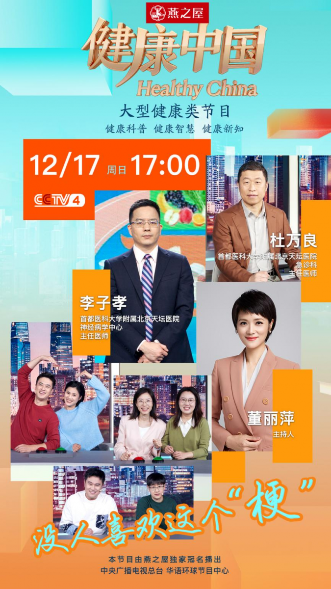 本期,由燕之屋獨家冠名的CCTV-4大型健康類(lèi)欄目《健康中國》特邀首都醫科大學(xué)附屬北京天壇醫院急診科主任醫師杜萬(wàn)良和首都醫科大學(xué)附屬北京天壇醫院神經(jīng)病學(xué)中心主任醫師李子孝為大家解讀腦梗死,從專(zhuān)業(yè)的角度分析它的致病機理和預防手段。