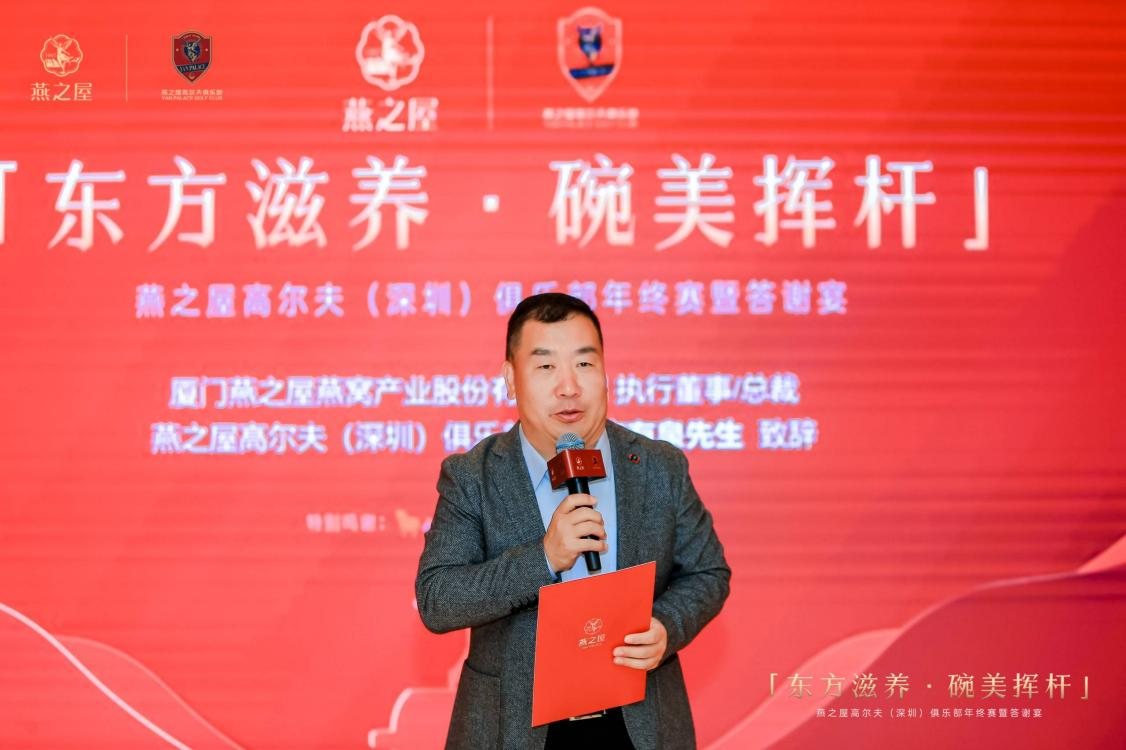 比賽結束后,所有嘉賓以及會(huì )員共聚答謝宴,品鑒佳肴、再續情誼。燕之屋執行董事兼總裁、燕之屋高爾夫(深圳)俱樂(lè )部會(huì )長(cháng)李有泉上臺發(fā)表致辭,并與眾領(lǐng)導嘉賓共同舉杯祝酒。燕之屋*26年專(zhuān)注高品質(zhì)燕窩(*燕之屋指燕之屋企業(yè)),堅持“源于天然,美與健康”的品牌理念,匠造健康、營(yíng)養、美味、便捷的優(yōu)質(zhì)燕窩,贏(yíng)得市場(chǎng)好口碑,于2023年在香港成功上市(股票代碼:01497.HK)。晚宴上,燕之屋旗下高端燕窩品牌“碗燕”產(chǎn)品碗燕·濃鮮款作為頭盤(pán)菜亮相餐桌,其營(yíng)養優(yōu)質(zhì)、口感濃稠,博得一眾好評。碗燕·濃鮮款甄選東南亞高品質(zhì)金絲燕燕窩,燕窩原料100%正規進(jìn)口,天然珍貴。采用121℃鮮萃工藝,密封燉煮,牢牢鎖住新鮮,產(chǎn)品0脂肪、0防腐劑、0增稠劑、0添加劑*(*指本產(chǎn)品生產(chǎn)過(guò)程中0%添加防腐劑山梨酸鉀、苯甲酸鈉,0%添加增稠劑瓊脂),是日常滋養的安心之選,也是高爾夫運動(dòng)人士的“碗”美拍檔。