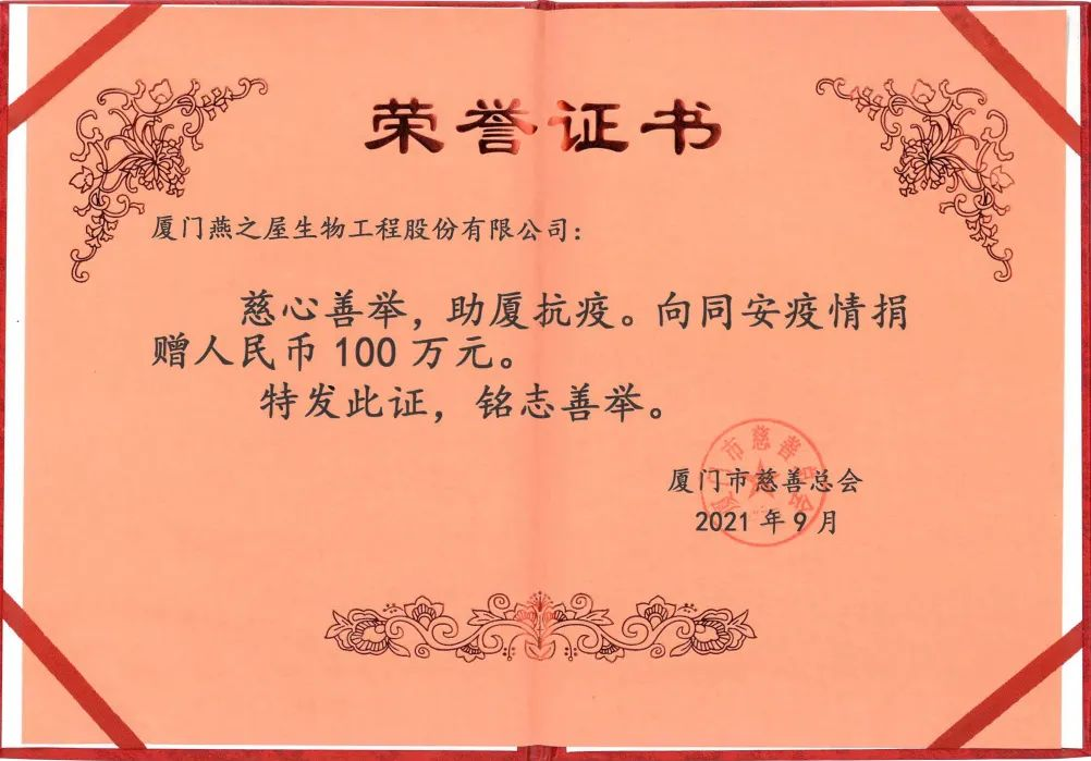 燕之屋落實(shí)企業(yè)擔當,在抗疫救災防護中積極展開(kāi)行動(dòng)。今年8月,特大暴雨襲擊河南期間,燕之屋及時(shí)響應捐贈100萬(wàn),助力河南新鄉災后防疫;9月份,廈門(mén)疫情爆發(fā)期間,燕之屋向廈門(mén)市慈善總會(huì )捐款100萬(wàn)元人民幣,并攜手金龍客車(chē)捐贈福建首輛移動(dòng)核酸采樣車(chē),還向正在隔離的孕婦、產(chǎn)婦贈送燕窩,助力“戰疫媽媽”迎接新生;10月份,在廈門(mén)走出疫情陰霾后,燕之屋為抗疫一線(xiàn)醫護人員捐贈面膜類(lèi)產(chǎn)品,感恩并助力醫護人員恢復狀態(tài)。