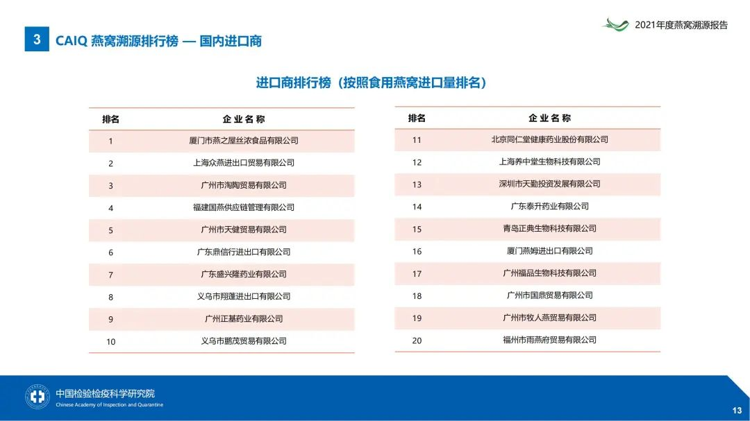 圖:2021年度CAIQ溯源燕窩國內進(jìn)口商排行榜(按照食用燕窩進(jìn)口量排名)