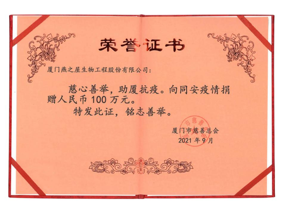 圖:燕之屋向同安疫情捐贈人民幣100萬(wàn)元,獲廈門(mén)市慈善總會(huì )頒發(fā)榮譽(yù)證書(shū)