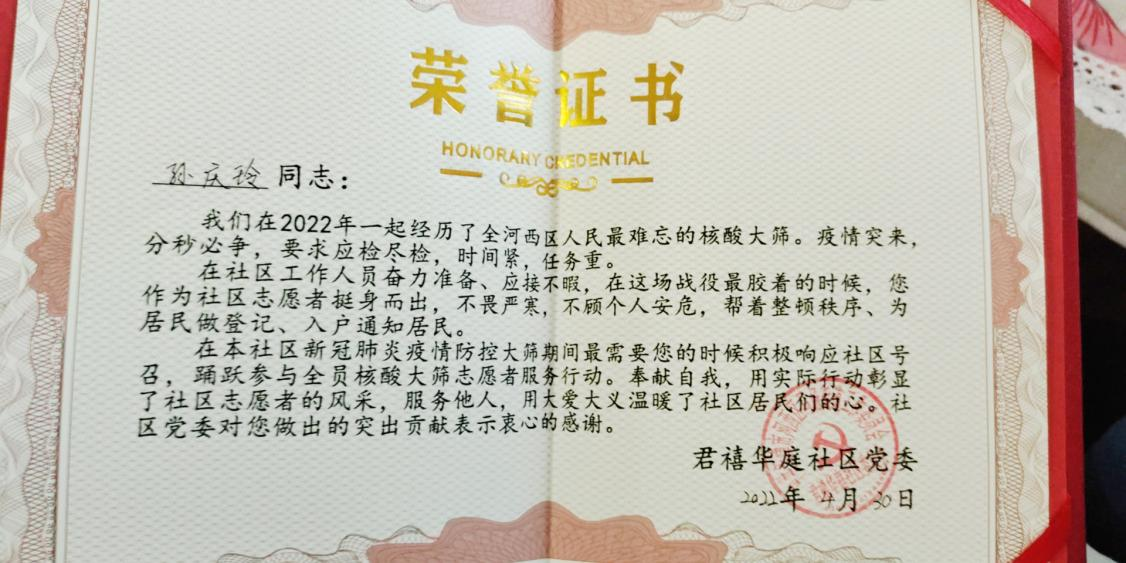 圖:燕之屋天津市場(chǎng)操盤(pán)手孫慶玲收到君禧華庭社區黨委的榮譽(yù)證書(shū)