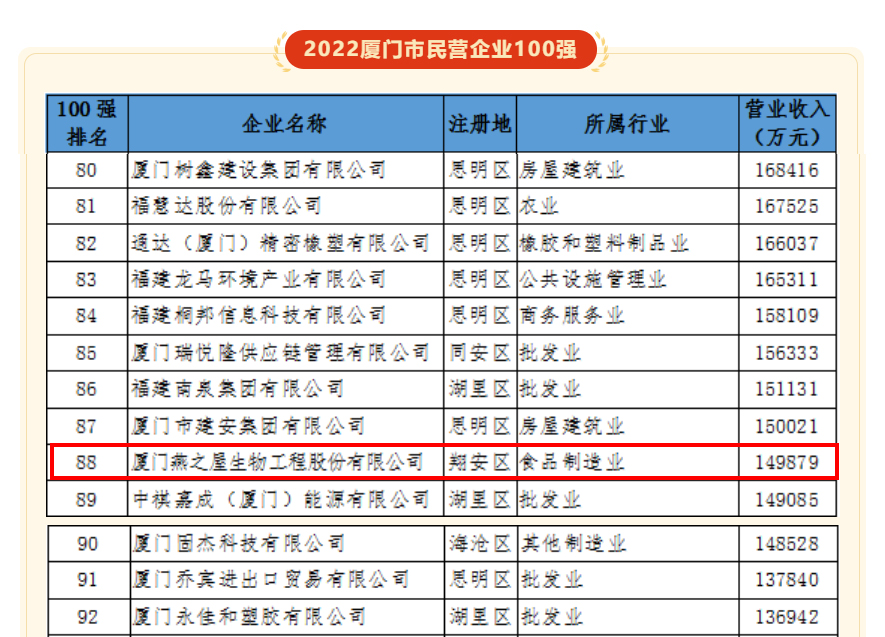 圖:燕之屋榮獲2022年廈門(mén)市民營(yíng)企業(yè)100強