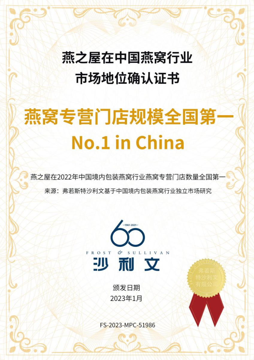 圖:燕之屋在2022年中國境內包裝燕窩行業(yè)燕窩專(zhuān)營(yíng)門(mén)店數量全國第一