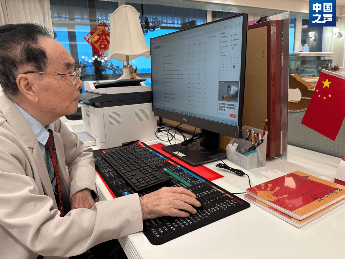 圖:95歲的侯云德每天在電腦前學(xué)習新知識和進(jìn)行學(xué)術(shù)創(chuàng )作