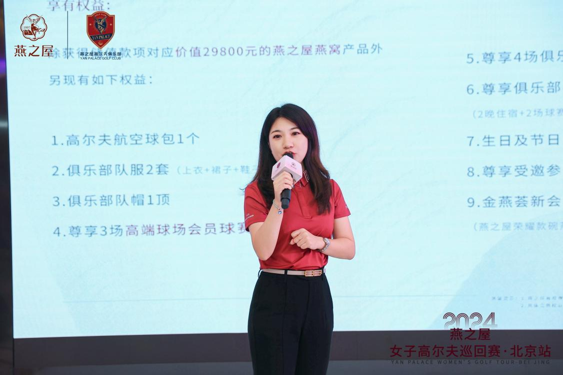 燕之屋26年專(zhuān)注高品質(zhì)燕窩,踐行“源于天然,美與健康”的理念,與高爾夫運動(dòng)所蘊含的健康生活理念深度契合。燕之屋以高爾夫運動(dòng)為紐帶,在全國范圍內建立燕之屋高爾夫俱樂(lè )部,致力于打造一個(gè)集高端賽事、精英沙龍、休閑交流于一體的綜合性平臺,為廣大高爾夫愛(ài)好者提供了一個(gè)競技交流、展示美、傳遞美的舞臺,讓每一位成員都能在這里找到歸屬感,享受高品質(zhì)生活帶來(lái)的愉悅與滿(mǎn)足。席間,燕之屋北京高爾夫俱樂(lè )部秘書(shū)長(cháng)徐可上臺為嘉賓們詳細介紹燕之屋高爾夫俱樂(lè )部,傳遞“因愛(ài)而生,為愛(ài)揮桿”健康理念,并向在座嘉賓發(fā)出會(huì )員邀請。