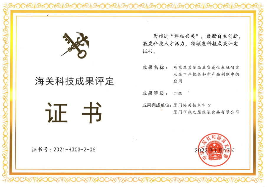 近日,海關(guān)總署正式頒布2021年度海關(guān)科技成果評定結果,共評定出一級成果9項、二級成果21項、三級成果63項。其中,由燕之屋與廈門(mén)海關(guān)技術(shù)中心聯(lián)合完成的科研項目《燕窩及其制品真實(shí)屬性表征研究及在口岸把關(guān)和新產(chǎn)品創(chuàng )制中的應用》獲評海關(guān)科技成果評定二級。