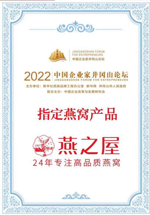 圖:燕之屋榮膺2022中國企業(yè)家井岡山論壇指定燕窩產(chǎn)品
