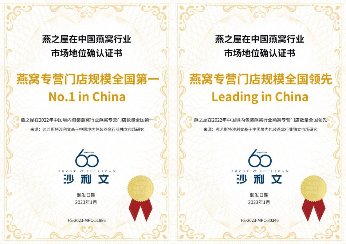 近日,燕之屋經(jīng)知名咨詢(xún)機構弗若斯特沙利文有限公司認證,獲得四項2022年度中國燕窩行業(yè)市場(chǎng)地位確認證書(shū),分別是燕窩工廠(chǎng)規模全國最大、燕窩工廠(chǎng)規模全國領(lǐng)先、燕窩專(zhuān)營(yíng)門(mén)店規模全國第一、燕窩專(zhuān)營(yíng)門(mén)店規模全國領(lǐng)先,2022年度雙料全國第一的佳績(jì),足見(jiàn)品牌強勁實(shí)力。